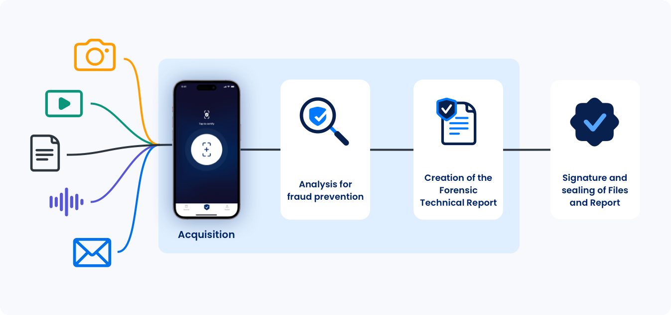 Collection of photos, videos, audio, screenshots, and other multimedia content with a patented forensic methodology.