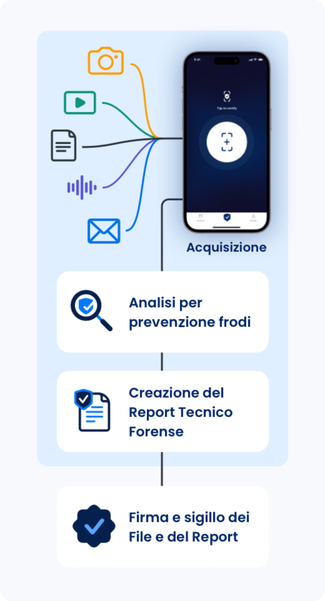 Certificare autenticità e immutabilità di foto, video, screenshot e documenti all'origine.
