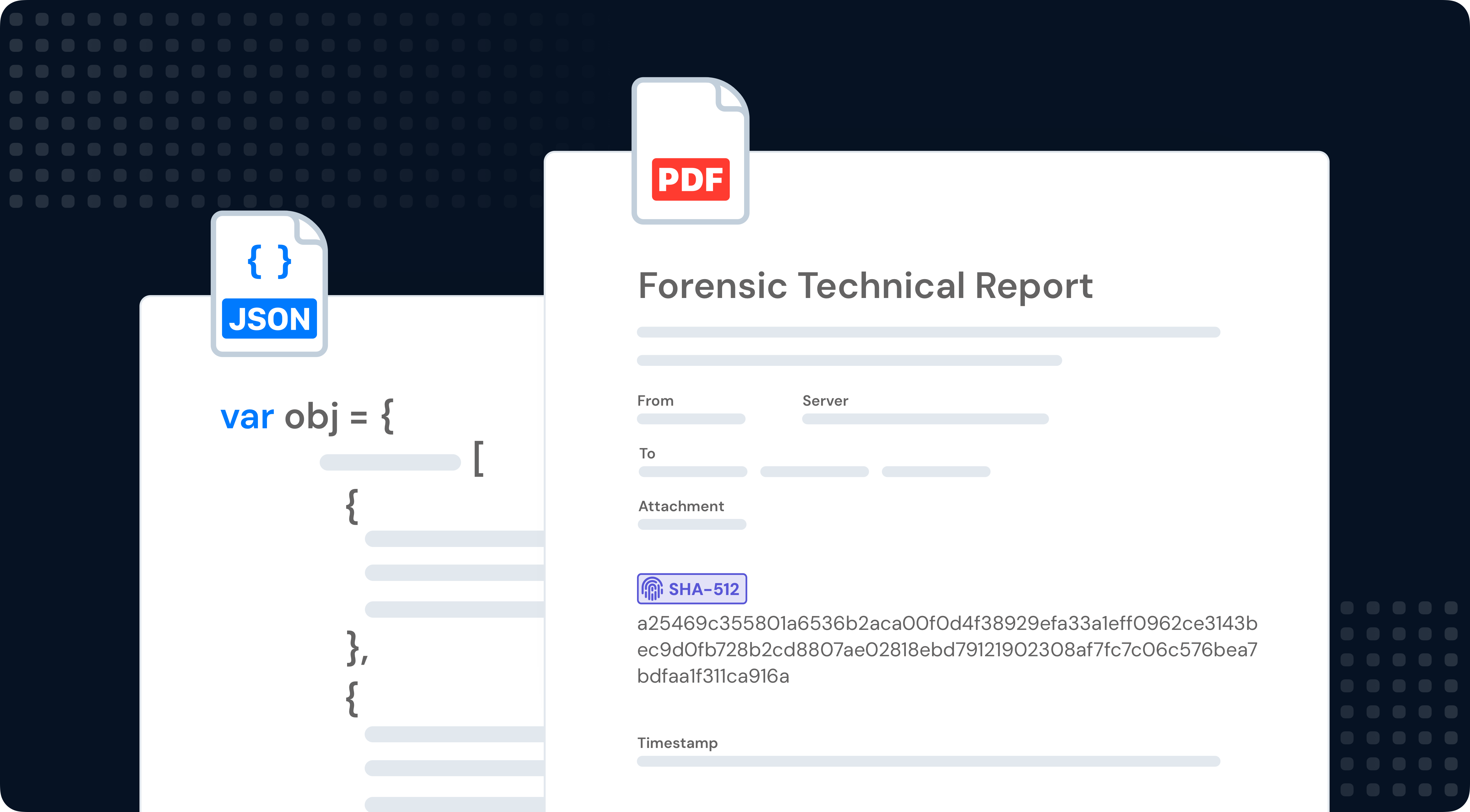 Genera una documentazione tecnica forense compresa di tutti i dati e i metadati tecnici (disponibili in formato PDF e JSON).